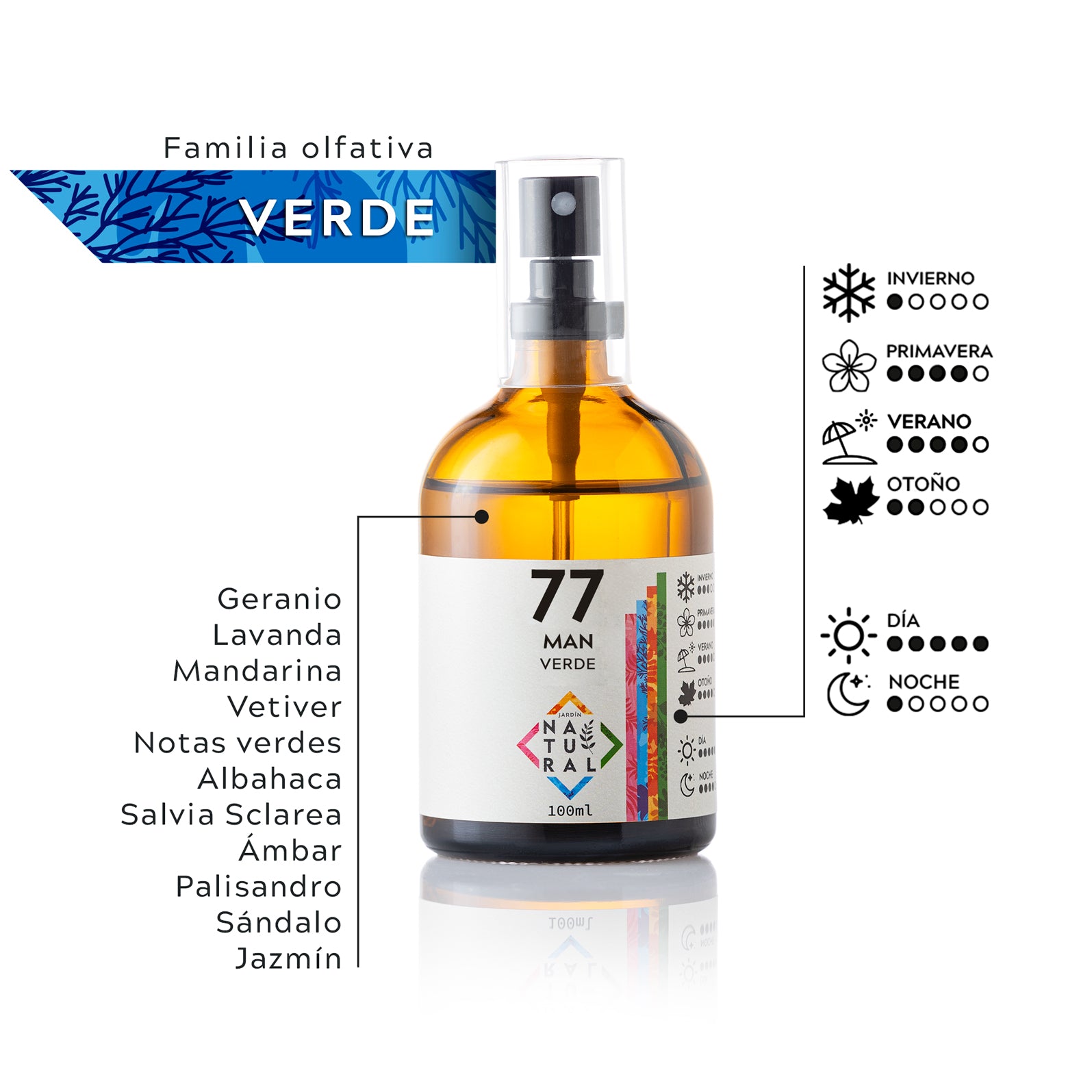 Geranio | Lavanda | Mandarina | Vetiver | Notas verdes | Albahaca | Salvia Sclarea | Ámbar | Palisandro | Sándalo | Jazmín